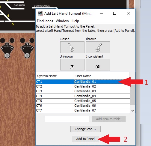 Na janela de Opções de Edição, clique na caixa “Select the type of icon to add to panel:” (1) e escolha uma das opções “Right Hand Turnout” ou “Left Hand Turnout” conforme o tipo (Direito ou Esquerdo) do AMV deste controle. No exemplo vamos configurar o AMV 1 que é um desvio a esquerda (“Left Hand Turnout”):